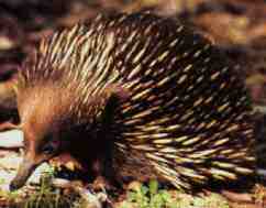 It is an egg laying marsupial called a monotreme. An echidna is about 50 cm (20 inches) long and it is dome-shaped. It has short sharp spikes covering its body (like a porcupine). It has a short pointy snout and a sticky tongue with which it catches ants and termites. It has no teeth. The echidna has very sharp claws too and can burrow underground very quickly. An echidna has short stubby feet and waddles when it walks. When it gets frightened it raises its spikes to defend itself and trys to dig itself into the ground. You can see how the echidna is trying to