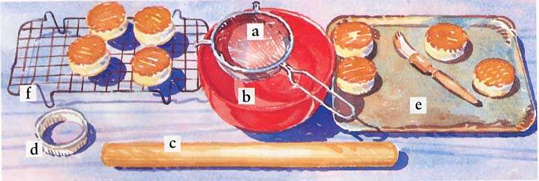 Sieve(a), mixing bowl(b), rolling pin(c), pastry cutter(d), baking sheet(e),and cooling rack(f)