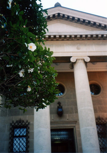 In front of the main hall. We can see a white sasanqua's tree on the left. Through all seasons, there are various flowers - for example, in summer the Lotus of Monet are blooming in a pond. |