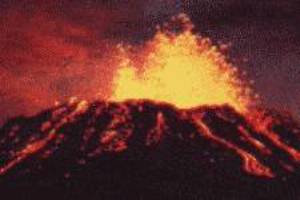 skyline). Lava erupting from the cone flows through a tube system down Pulama