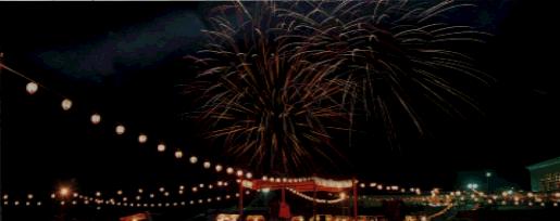dancing and fireworks at night. Huge flowers spread over