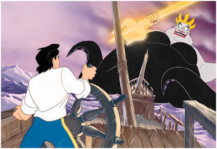 Prince Eric bravely steered a ship into Ursula and destroyed the giant