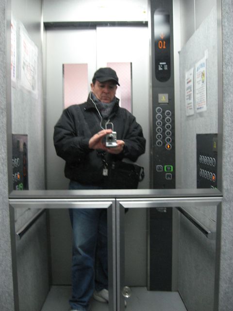 The mirroe often makes you forget the security camera broadcasting your image to the people waiting on the first floor.